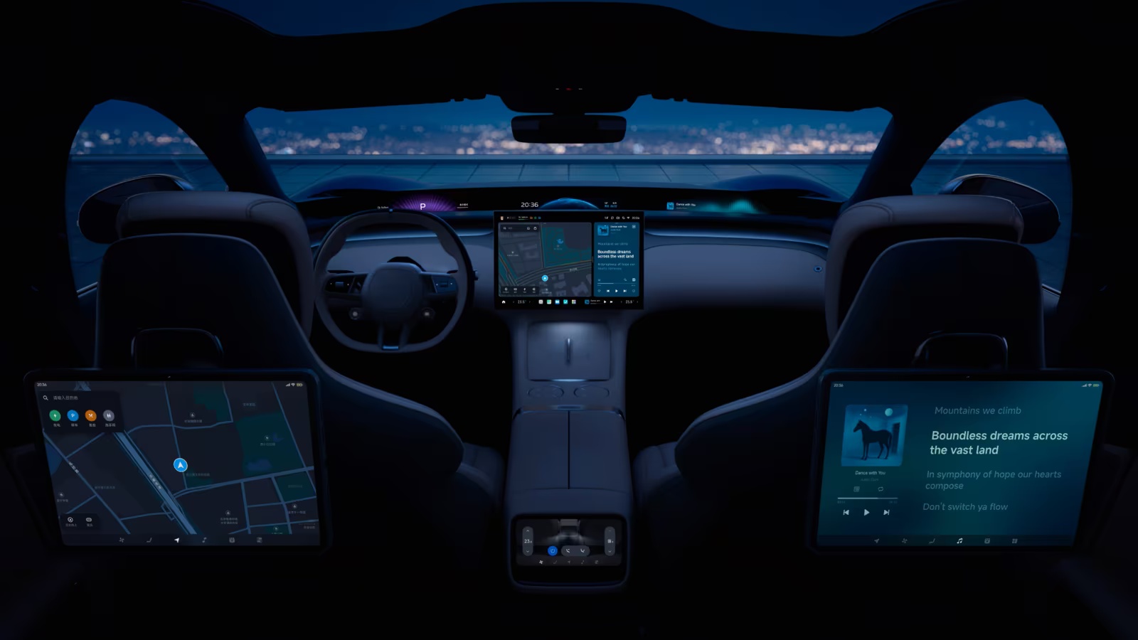 Dashbordet domineres av en HyperVision Panoramic Display, en skjerm som strekker seg over hele bilens bredde. I tillegg kommer en 16,1-tommers infotainmentskjerm foran og egne skjermer for baksetepassasjerene.