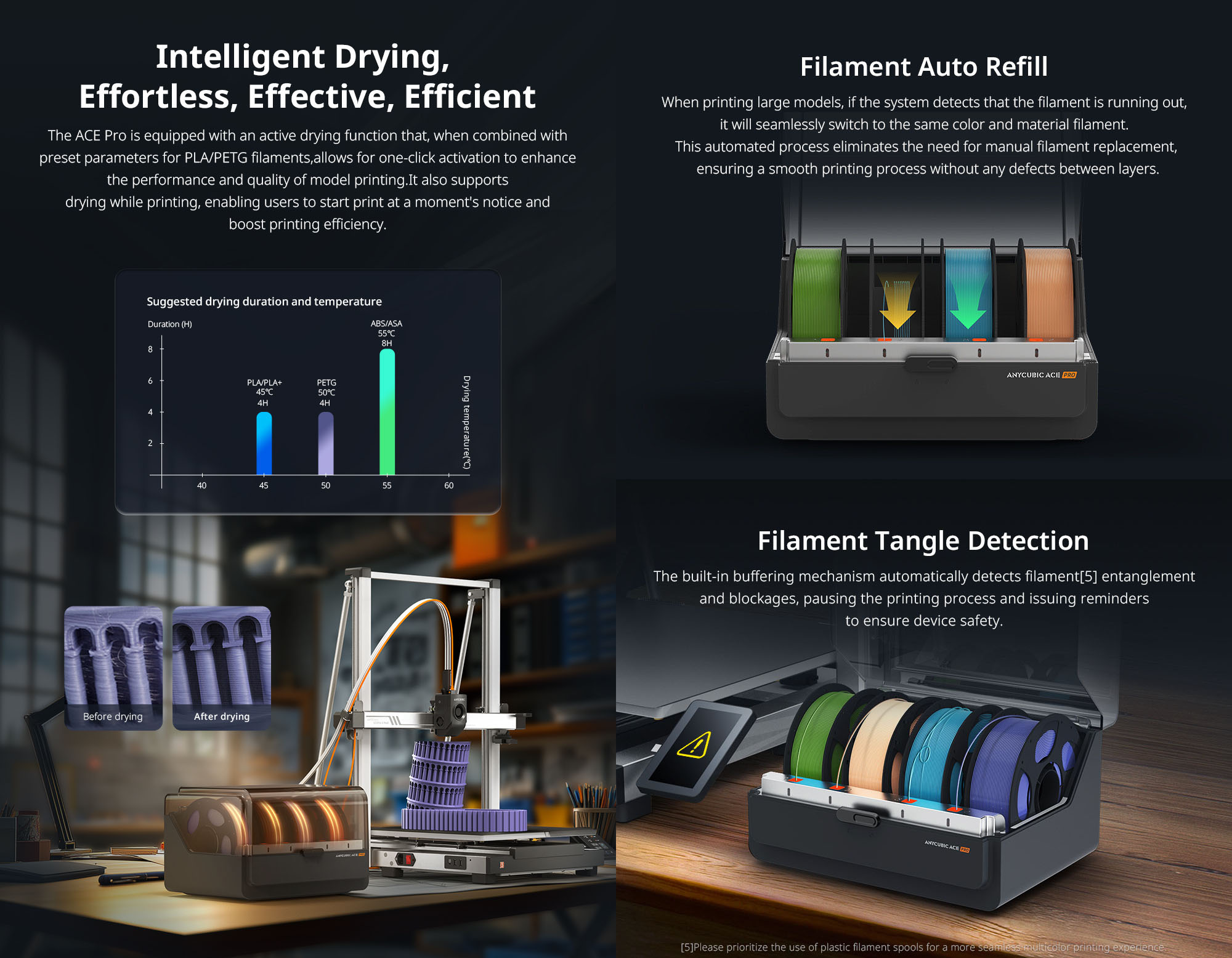 Filamentet holdes tørt og byttes automatisk når én spole er tom – ideelt for lange jobber og høy driftstid. -