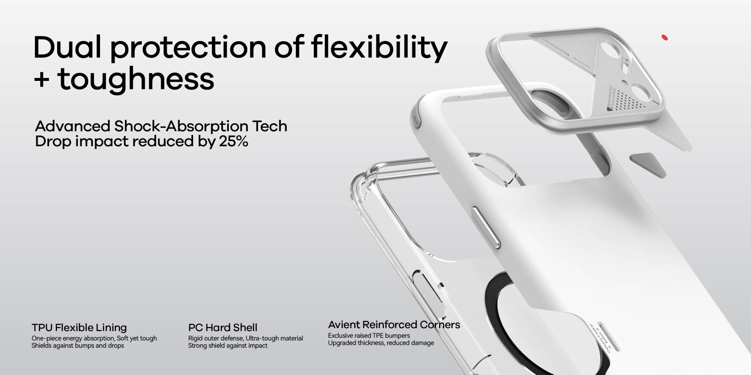 De forsterkede hjørnene gir forbedret støtabsorpsjon og reduserer risikoen for skader ved fall. En metallisk kameraramme beskytter linsene mot riper, mens den integrerte varmeledende strukturen bidrar til å spre varme under intensiv bruk.