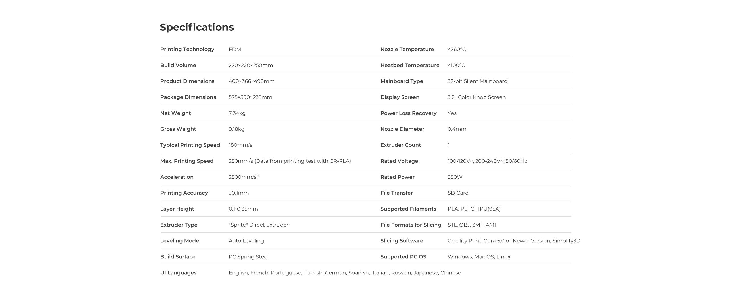 (For mer detaljert teknisk informasjon om skriveren, se Creality Wiki.)