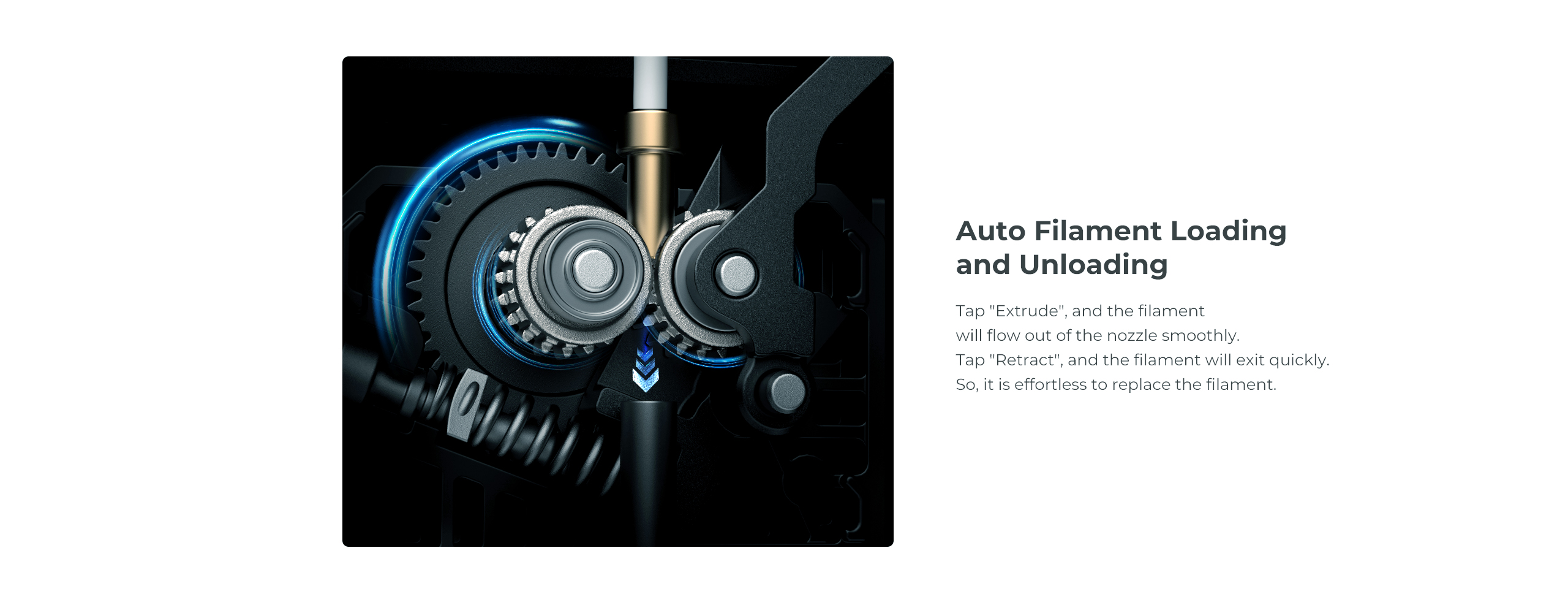 Enkel filamenthåndtering – funksjonene «Extrude» og «Retract» muliggjør automatisk inn- og utmating av filament.