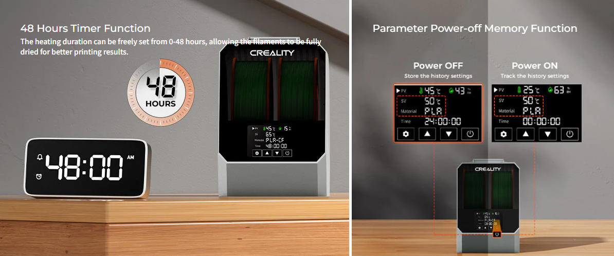 Forbedret arbeidsflyt – to spoler tørkes parallelt, perfekt for kontinuerlig filamentbruk og multitasking.