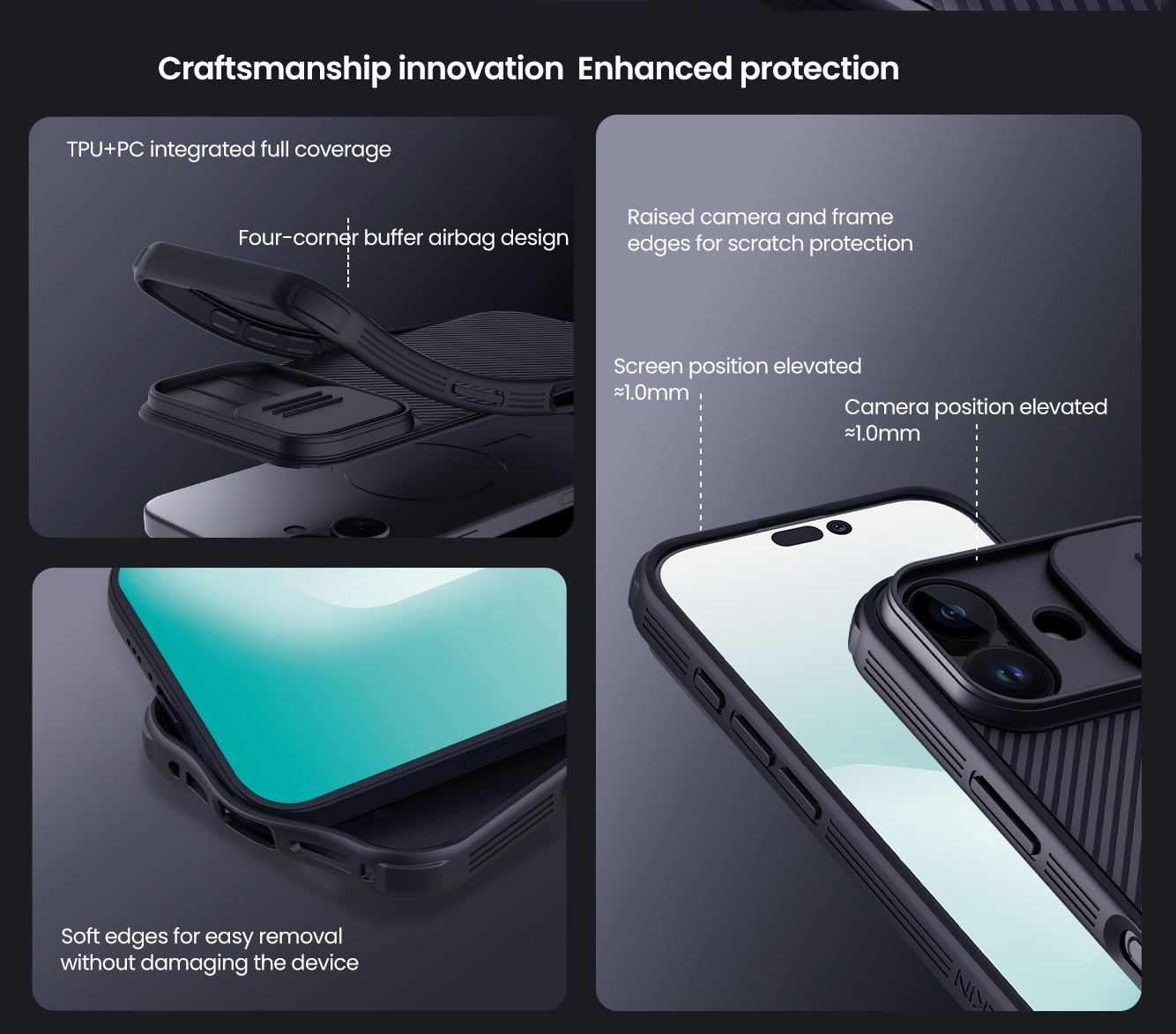 NILLKIN MagSafe CamShield Pro er et premium deksel for iPhone 17-serien, som kombinerer funksjonell design med robust beskyttelse. Dekselet har en skyvbar linsebeskytter som skjuler kameraet når det ikke brukes, samt åpnes åpent ved fotografering.