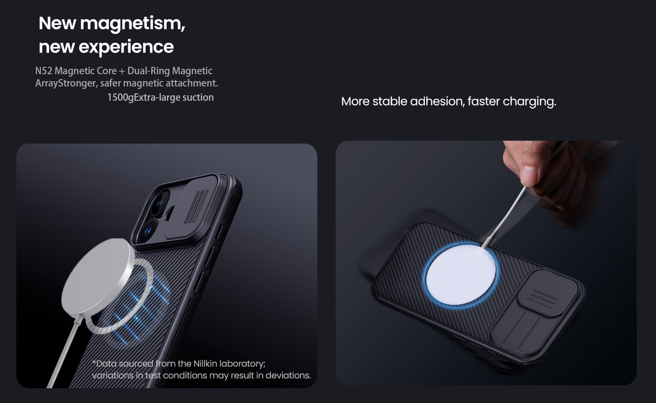 Integrert N52-magneter og dobbel ringmagnet sikrer stabil magnetisk festing og kompatibilitet med MagSafe-tilbehør og hurtigladning. Dekselet holder en sterk magnetisk kraft (≈1500g) for trygg montering.