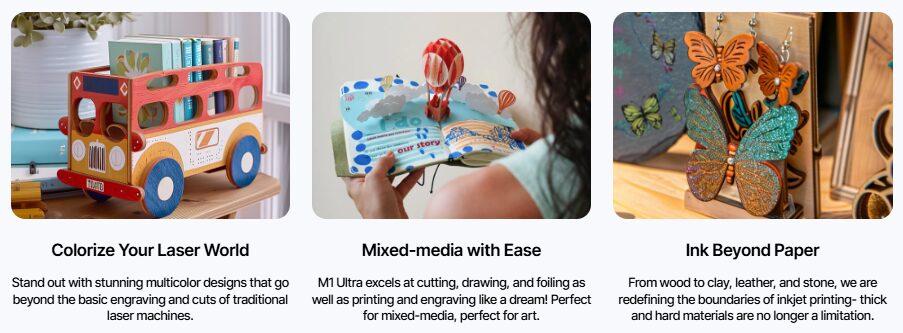 M1 Ultra er designet for hobbybrukere, små studioer, håndverkere og kreative entusiaster. Med én maskin kan du utføre en rekke prosesser uten å bytte utstyr, noe som sparer tid og plass.