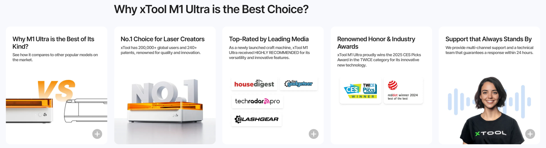 xTool M1 Ultra er en banebrytende 4-i-1 kreative maskin som kombinerer fire funksjoner i én enhet: lasergravering og skjæring, skjæreklinge, fargeutskrift og automatisk penntegning. Den fungerer som et alt-i-ett verksted for håndverk, gaver, dekor og små produksjonsprosjekter – slik at du kan realisere ideene dine med én maskin.